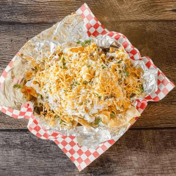 Topped with nacho cheese, cilantro, onions and sour cream. Loaded with carne asada, pollo asado, chile verde, al pastor, and birria, plus your choice of beans, cheese, salsa, and all garbage meats